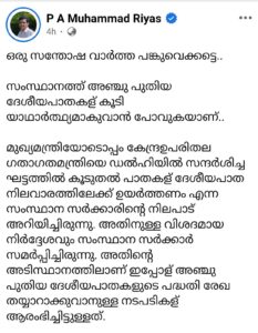 സംസ്ഥാനത്ത് അഞ്ച് പുതിയ ദേശീയപാതകൾ കൂടി യാഥാർത്ഥ്യമാകാൻ പോകുകയാണെന്ന് മന്ത്രി മുഹമ്മദ് റിയാസ്. മുഖ്യമന്ത്രി പിണറായി വിജയനൊപ്പം കേന്ദ്ര ഉപരിതല ഗതാഗത മന്ത്രി നിതിൻ ഗഡ്കരിയെ ഡൽഹിയിൽ സന്ദർശിച്ചപ്പോൾത്തന്നെ കൂടുതൽ പാതകൾ ദേശീയപാത നിലവാരത്തിലേക്ക് ഉയർത്തണം എന്ന സംസ്ഥാന സർക്കാരിന്റെ നിലപാട് അറിയിച്ചിരുന്നുവെന്ന് മന്ത്രി ഫെയ്സ്ബുക്ക് കുറിപ്പിൽ വ്യക്തമാക്കി.