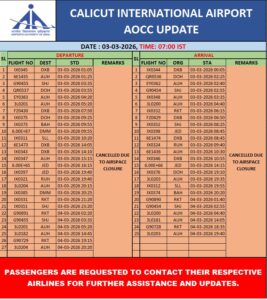 ഗൾഫ് സംഘർഷം: കോഴിക്കോട് കരിപ്പൂരിൽ 52 വിമാനങ്ങൾ റദ്ദാക്കി Posted by Surya Desk | Mar 3, 2026 Spread the loveകോഴിക്കോട്: പശ്ചിമേഷൻ സംഘർഷത്തിന്റെ പശ്ചാത്തലത്തിൽ കോഴിക്കോട് വിമാനത്താവളത്തിൽ ചൊവ്വാഴ്ചയും ഫ്ലൈറ്റ് റദ്ദാക്കൽ. ഗൾഫ് യൂറോപ്യൻ രാജ്യങ്ങളിൽ നിന്നുള്ള 52 ഫ്ലൈറ്റുകളാണ് ചൊവ്വാഴ്ച റദ്ദാക്കിയത്. ചാർട്ട് ചുവടെ Post Views: 90