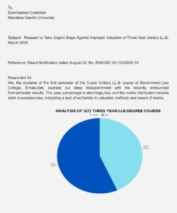 പരീക്ഷ എഴുതിയ 127 വിദൃാർത്ഥകളിൽ Tort 47, constitution 39, CPC 62, BNS 39,Environmental Law 45 എന്നിങ്ങനെയാണ് പരാജയപ്പെട്ടവരുടെ എണ്ണം. ഉത്തരക്കടലാസ് വാലുവേഷൻപുനരിശേധനക്ക് വിധേയമാക്കണമെന്നാണ് അവരുടെ ആവശൃം.