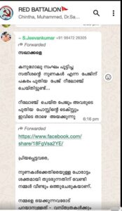 ‘പിആര്‍ഡി അസിസ്റ്റന്റ് എഡിറ്റര്‍ ആണ്. സര്‍വ്വശ്രീ ജീവന്‍കുമാര്‍. സര്‍ക്കാര് ശമ്പളം വാങ്ങി സിപിഎമ്മിന് വേണ്ടി പണിയെടുക്കുന്ന മഹാ മാന്യന്‍ പേഴ്‌സണല്‍ നമ്പറില്‍ നിന്ന് നടത്തുന്ന രാഷ്ട്രീയ പ്രചരണം. പ്രമുഖ നേതാക്കളുടെ റെഡ് ബറ്റാലിയന്‍ വാട്‌സ്ആപ്പ് ഗ്രൂപ്പില്‍ നിന്നും ചോര്‍ന്നതാണ്. സര്‍ക്കാര്‍ ഉദ്യോഗസ്ഥന്‍ , നേരത്തെ കൈരളിയില്‍ ജോലി ചെയ്തിരുന്ന ആളായിരുന്നു. നഗ്‌നമായ പദവി ദുരുപയോഗം നടത്തി സിപിഎം പ്രചരണം നടത്തുന്നതിന്റെ തെളിവാണിത്
