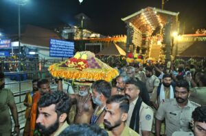 ഗണപതി ഹോമത്തിന് ശേഷം രാവിലെ 6.15 ന് പതിനെട്ടാം പടിയിറങ്ങി പെരിയസ്വാമി മരുതുവന ശിവന്കുട്ടിയുടെ നേതൃത്വത്തിലുള്ള സംഘം യാത്രയായി. വന്ന പാതയിലൂടെയാണ് 30 അംഗ സംഘത്തിന്റെ മടക്കം. ജനുവരി 23 ന് പന്തളം സ്രാമ്പിക്കല് കൊട്ടാരത്തിലെത്തും. ആദ്യ പെട്ടിയിലാണ് പതിനെട്ടാം പടി കയറി ഭഗവാനെ ചാര്ത്തുന്ന തിരുവാഭരണം. തിരുമുഖം, പ്രഭ, ചുരിക, വാള്, പുഷ്ക്കല, പൂര്ണ രൂപങ്ങള്, ആന, കടുവ, പുലി രൂപങ്ങള്, വലംപിരി ശംഖ് തുടങ്ങിയവയുണ്ട്.