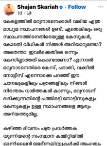 കേരളത്തിലെ അംഗീകൃത മാധ്യമപ്രവർത്തകരുടെ ഏക സംഘടനയായ കേരള പത്രപ്രവർത്തക യൂണിയൻ ഓൺലൈൻ മാധ്യമങ്ങളിലെ മാധ്യമപ്രവർത്തകർക്ക് അംഗത്വം നൽകുന്നത് സംബന്ധിച്ച് കഴിഞ്ഞദിവസം സംസ്ഥാന കമ്മിറ്റിയിൽ വന്ന ചർച്ച ചൂണ്ടിക്കാട്ടിയാണ് ഷാജന്റെ ഫേസ്ബുക്ക് പോസ്റ്റ്.